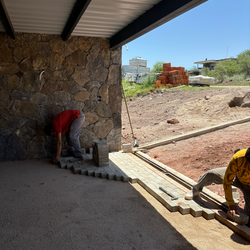 La propuesta para la cochera se concibe como una intervención respetuosa que retoma el lenguaje material del sitio. Cuatro muros de piedra, ejecutados con la misma técnica y materialidad de la edificación preexistente, definen el perímetro del nuevo volumen. Lejos de limitarse a una función utilitaria, estos muros estructuran un nuevo patio de acceso que actúa como transición entre la calle y el interior de la casa: un espacio intermedio que organiza, protege y da respiro.